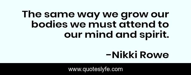 This page presents the quote "The same way we grow our bodies we must attend to our mind and spirit.". Author of this quote is Nikki Rowe. This quote is about strength, mindfulness, mindset, inner-being, awakening, growth, perspective, awaken, spirit,.