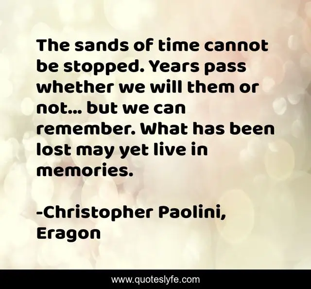 This page presents the quote "The sands of time cannot be stopped. Years pass whether we will them or not... but we can remember. What has been lost may yet live in memories.". Author of this quote is Christopher Paolini, Eragon. This quote is about memories, time,.