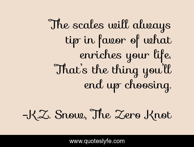 This page presents the quote "The scales will always tip in favor of what enriches your life. That’s the thing you’ll end up choosing.". Author of this quote is K.Z. Snow, The Zero Knot. .