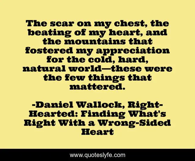 This page presents the quote "The scar on my chest, the beating of my heart, and the mountains that fostered my appreciation for the cold, hard, natural world—these were the few things that mattered.". Author of this quote is Daniel Wallock, Right-Hearted: Finding What's Right With a Wrong-Sided Heart. This quote is about mountains, life, scars, love, nature, graditi, appreciation, significance, natural,.
