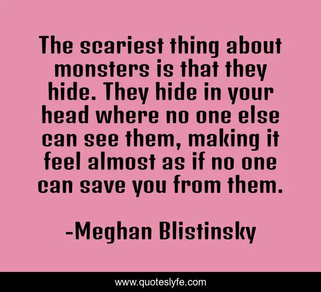 This page presents the quote "The scariest thing about monsters is that they hide. They hide in your head where no one else can see them, making it feel almost as if no one can save you from them.". Author of this quote is Meghan Blistinsky. This quote is about head, internal-struggles, demons, monsters,.