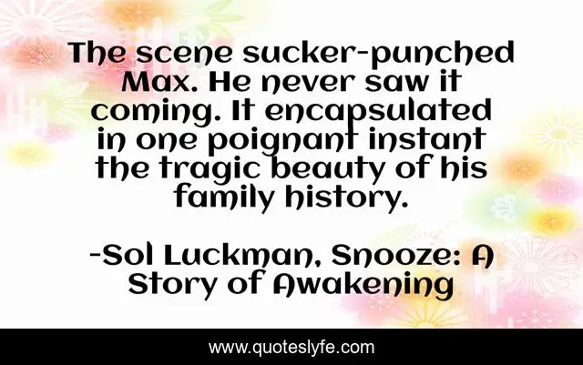 This page presents the quote "The scene sucker-punched Max. He never saw it coming. It encapsulated in one poignant instant the tragic beauty of his family history.". Author of this quote is Sol Luckman, Snooze: A Story of Awakening. This quote is about loss, beauty, family, sorrow, nostalgia, family-history, grief, sadness, personal-story,.