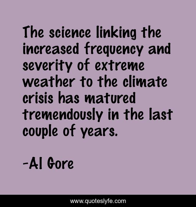 This page presents the quote "The science linking the increased frequency and severity of extreme weather to the climate crisis has matured tremendously in the last couple of years.". Author of this quote is Al Gore. This quote is about weather, crisis, years,.
