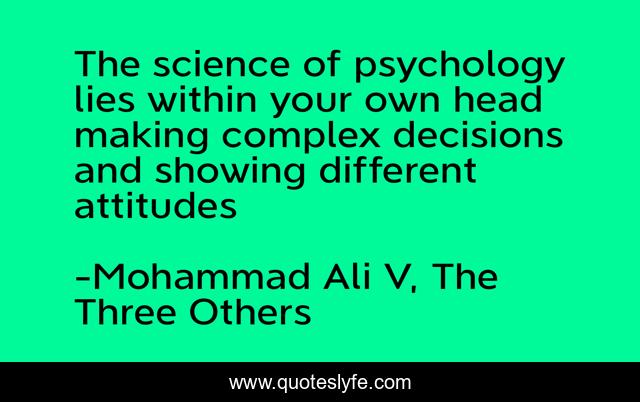 This page presents the quote "The science of psychology lies within your own head making complex decisions and showing different attitudes". Author of this quote is Mohammad Ali V, The Three Others. This quote is about mystery, darkness, crime, alone, thriller, psychology,.