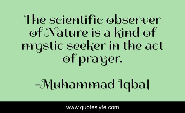 This page presents the quote "The scientific observer of Nature is a kind of mystic seeker in the act of prayer.". Author of this quote is Muhammad Iqbal. This quote is about kind, prayer, act,.