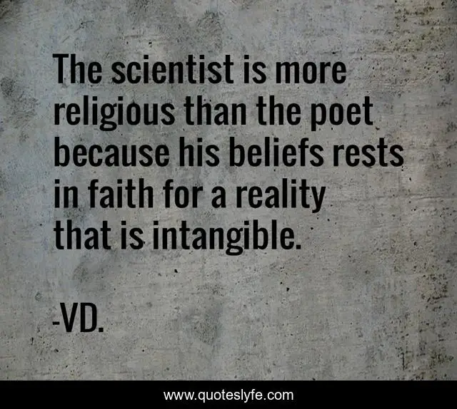 This page presents the quote "The scientist is more religious than the poet because his beliefs rests in faith for a reality that is intangible.". Author of this quote is VD.. This quote is about human, religion, science, mind, poetry, reality, spirituality, truth,.