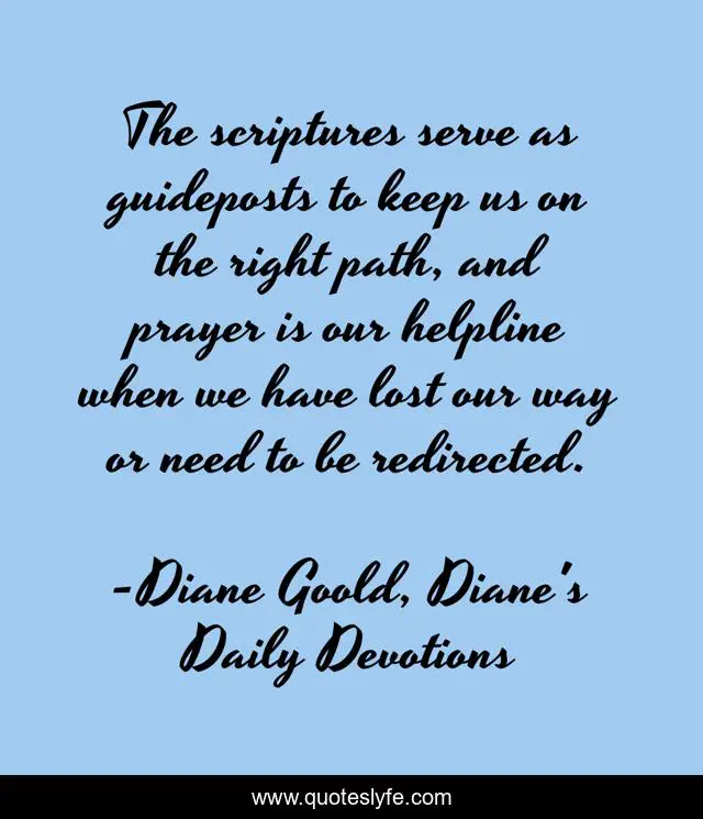 This page presents the quote "The scriptures serve as guideposts to keep us on the right path, and prayer is our helpline when we have lost our way or need to be redirected.". Author of this quote is Diane Goold, Diane's Daily Devotions. This quote is about devotions, scriptures, prayer,.