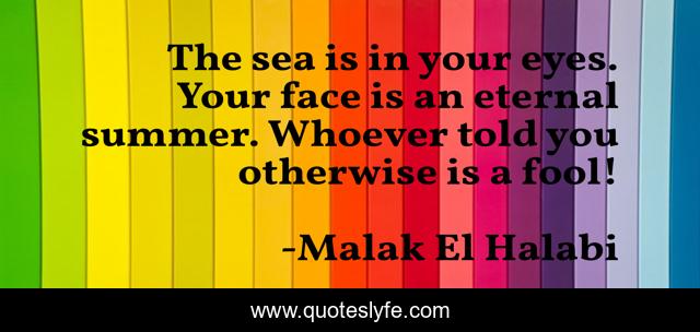 This page presents the quote "The sea is in your eyes. Your face is an eternal summer. Whoever told you otherwise is a fool!". Author of this quote is Malak El Halabi. This quote is about admiration, love, relationship, eyes, sea, affection,.