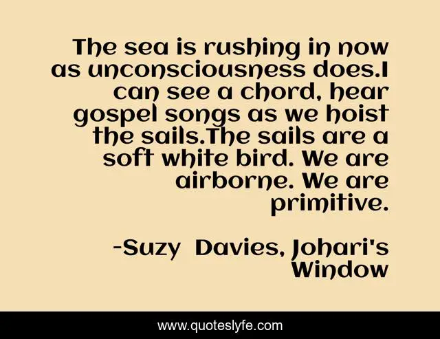 This page presents the quote "The sea is rushing in now as unconsciousness does.I can see a chord, hear gospel songs as we hoist the sails.The sails are a soft white bird. We are airborne. We are primitive.". Author of this quote is Suzy Davies, Johari's Window. This quote is about romance, magic-realism, fiction,.