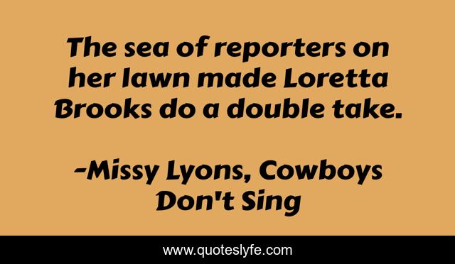 This page presents the quote "The sea of reporters on her lawn made Loretta Brooks do a double take.". Author of this quote is Missy Lyons, Cowboys Don't Sing. This quote is about paprazzi, writers, invasion-of-privacy, reporters,.