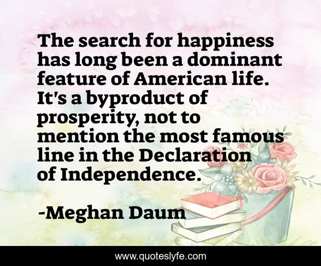 This page presents the quote "The search for happiness has long been a dominant feature of American life. It's a byproduct of prosperity, not to mention the most famous line in the Declaration of Independence.". Author of this quote is Meghan Daum. This quote is about life, american, happiness,.