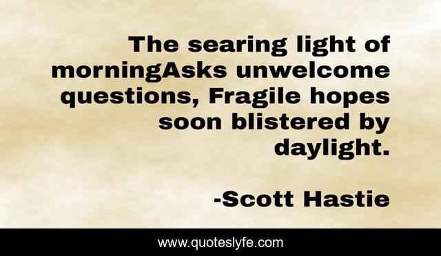 This page presents the quote "The searing light of morningAsks unwelcome questions, Fragile hopes soon blistered by daylight.". Author of this quote is Scott Hastie. This quote is about blister, spiritual, fragile-hopes, light, fragile, searing, poetry, morning, poetry-life,.