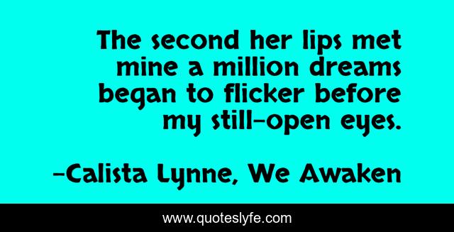 This page presents the quote "The second her lips met mine a million dreams began to flicker before my still-open eyes.". Author of this quote is Calista Lynne, We Awaken. This quote is about couple, love, kiss, affection,.