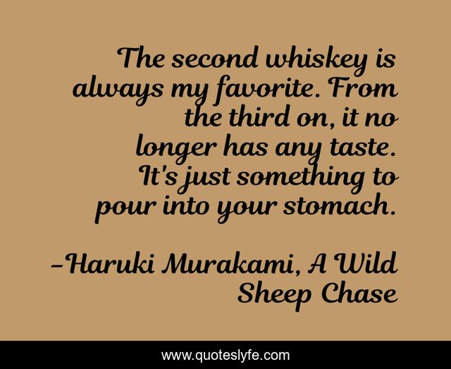 This page presents the quote "The second whiskey is always my favorite. From the third on, it no longer has any taste. It's just something to pour into your stomach.". Author of this quote is Haruki Murakami, A Wild Sheep Chase. This quote is about whiskey, alcohol,.