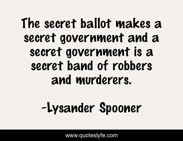This page presents the quote "The secret ballot makes a secret government and a secret government is a secret band of robbers and murderers.". Author of this quote is Lysander Spooner. This quote is about band, secret, ballot,.