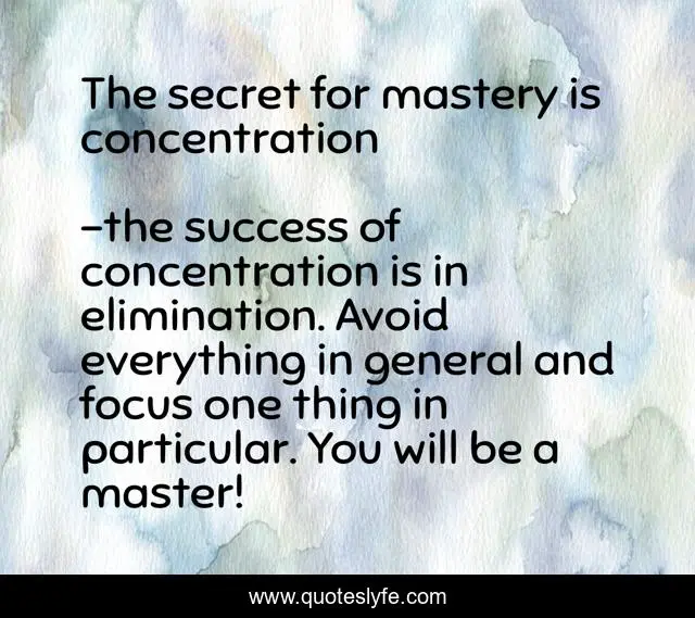 "the success of concentration is in elimination. Avoid everything in general and focus one thing in particular. You will be a master! Quotes." Quoteslyfe.com, 2025. Sat. 06 Dec. 2025. <https://www.quoteslyfe.com/quote/The-secret-for-mastery-is-concentration-129460>.