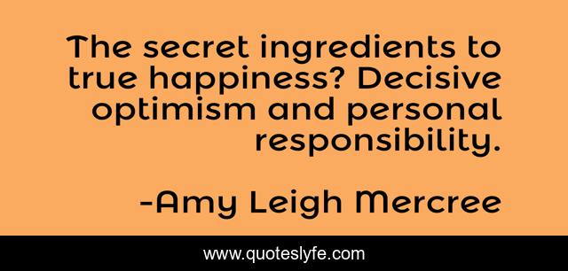 This page presents the quote "The secret ingredients to true happiness? Decisive optimism and personal responsibility.". Author of this quote is Amy Leigh Mercree. This quote is about personal-responsibility, quotes-de-la-vida, amy-leigh-mercree, quote-of-the-day, quotes-optimism, quotes-tumblr, happiness, inspirational, quote-about-life,.
