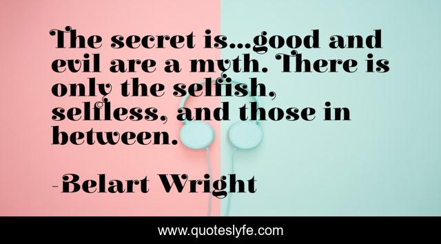 This page presents the quote "The secret is...good and evil are a myth. There is only the selfish, selfless, and those in between.". Author of this quote is Belart Wright. This quote is about enthusiasm, philosophical, humanitarian, inspirational, truth,.