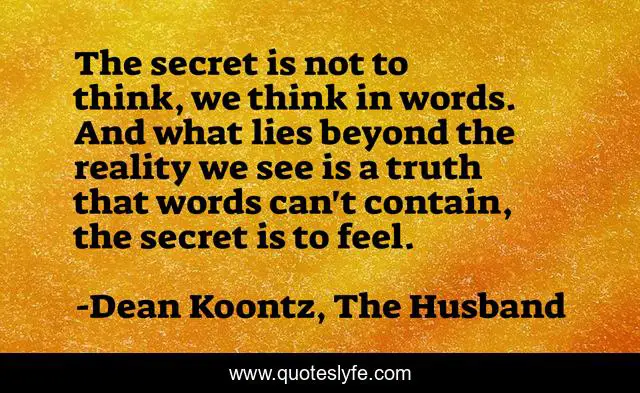 This page presents the quote "The secret is not to think, we think in words. And what lies beyond the reality we see is a truth that words can't contain, the secret is to feel.". Author of this quote is Dean Koontz, The Husband. This quote is about enthusiasm, inspiring, inspirational,.