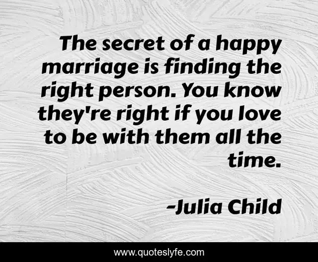 This page presents the quote "The secret of a happy marriage is finding the right person. You know they're right if you love to be with them all the time.". Author of this quote is Julia Child. This quote is about marriage, anniversary, time,.