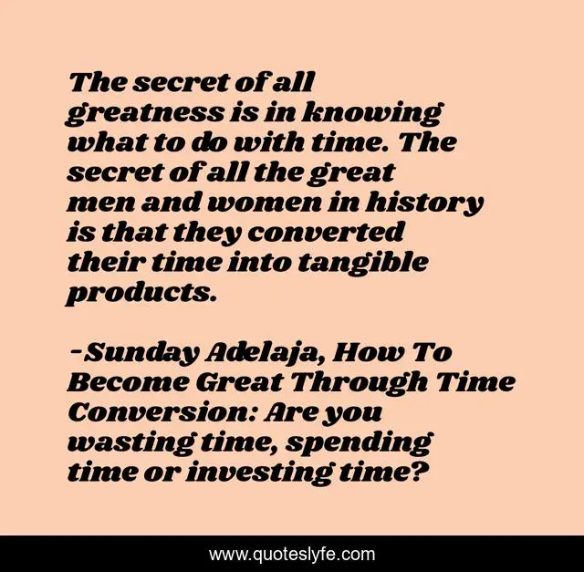 This page presents the quote "The secret of all greatness is in knowing what to do with time. The secret of all the great men and women in history is that they converted their time into tangible products.". Author of this quote is Sunday Adelaja, How To Become Great Through Time Conversion: Are you wasting time, spending time or investing time?. This quote is about life, great-people, conversion, productivity, wealth, greatness, waste, humanity, product,.
