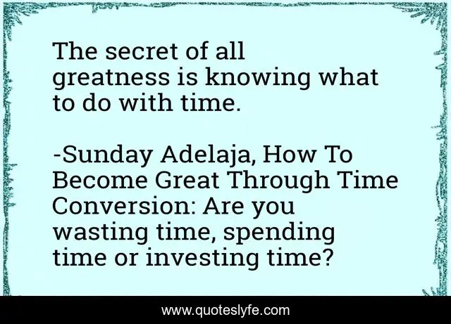 This page presents the quote "The secret of all greatness is knowing what to do with time.". Author of this quote is Sunday Adelaja, How To Become Great Through Time Conversion: Are you wasting time, spending time or investing time?. This quote is about time-management, product, conversion, productivity, wealth, greatness, waste, humanity, life,.