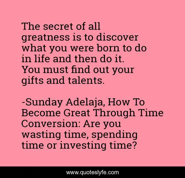 This page presents the quote "The secret of all greatness is to discover what you were born to do in life and then do it. You must find out your gifts and talents.". Author of this quote is Sunday Adelaja, How To Become Great Through Time Conversion: Are you wasting time, spending time or investing time?. This quote is about discovery-of-oneself, life, discover-yourself, calling, conversion, productivity, wealth, secret, talents-and-gifts,.