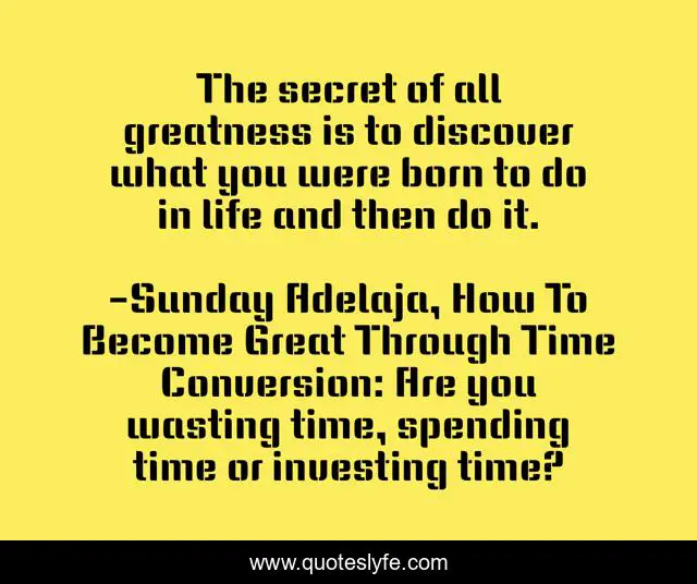 This page presents the quote "The secret of all greatness is to discover what you were born to do in life and then do it.". Author of this quote is Sunday Adelaja, How To Become Great Through Time Conversion: Are you wasting time, spending time or investing time?. This quote is about life, fulfilling-purpose, conversion, productivity, wealth, greatness, waste, humanity, product,.