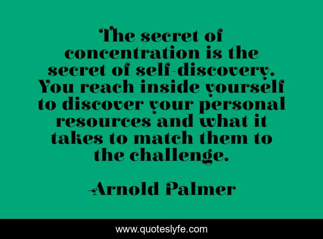 This page presents the quote "The secret of concentration is the secret of self-discovery. You reach inside yourself to discover your personal resources and what it takes to match them to the challenge.". Author of this quote is Arnold Palmer. .