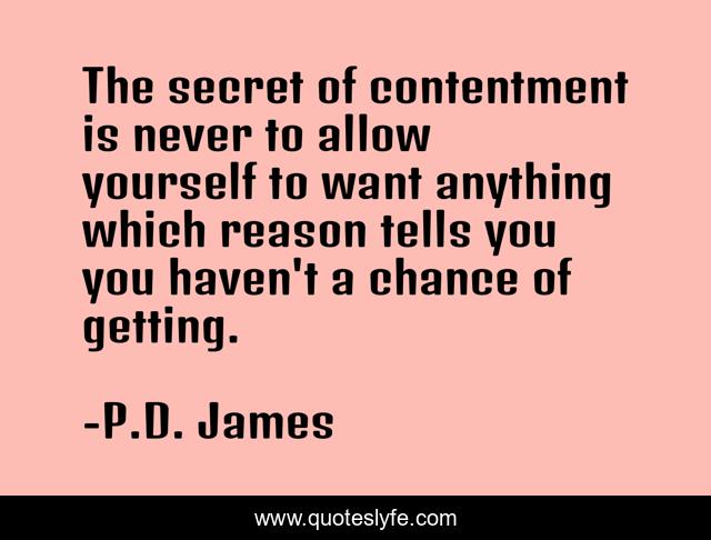This page presents the quote "The secret of contentment is never to allow yourself to want anything which reason tells you you haven't a chance of getting.". Author of this quote is P.D. James. This quote is about rationalism, contentment, happiness,.