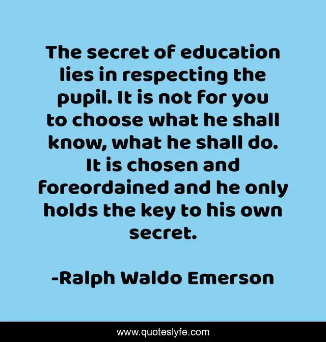 This page presents the quote "The secret of education lies in respecting the pupil. It is not for you to choose what he shall know, what he shall do. It is chosen and foreordained and he only holds the key to his own secret.". Author of this quote is Ralph Waldo Emerson. This quote is about self-education, education, initiative,.