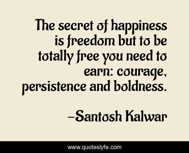 This page presents the quote "The secret of happiness is freedom but to be totally free you need to earn: courage, persistence and boldness.". Author of this quote is Santosh Kalwar. This quote is about freedom, inspirational, enthusiasm,.