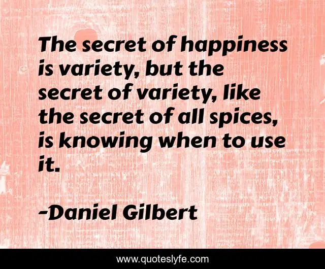 This page presents the quote "The secret of happiness is variety, but the secret of variety, like the secret of all spices, is knowing when to use it.". Author of this quote is Daniel Gilbert. This quote is about knowing, secret, like,.