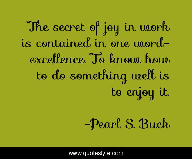 This page presents the quote "The secret of joy in work is contained in one word-excellence. To know how to do something well is to enjoy it.". Author of this quote is Pearl S. Buck. .