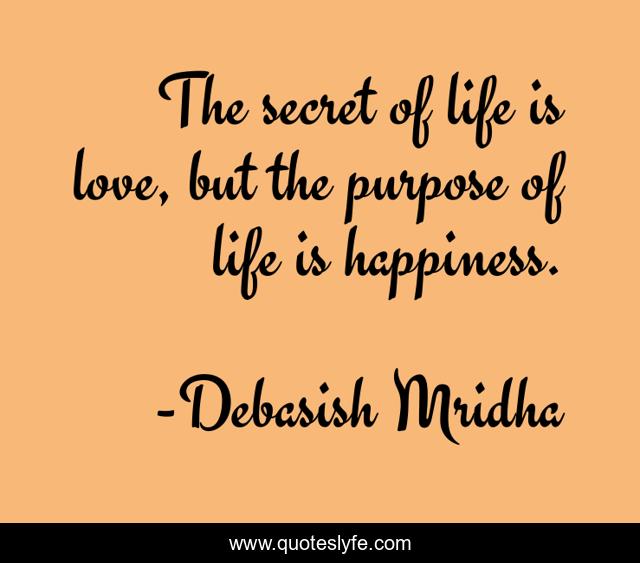 This page presents the quote "The secret of life is love, but the purpose of life is happiness.". Author of this quote is Debasish Mridha. This quote is about life, love, knowledge, inspirational, intelligence, purpose, philosophy, wisdom, secret,.