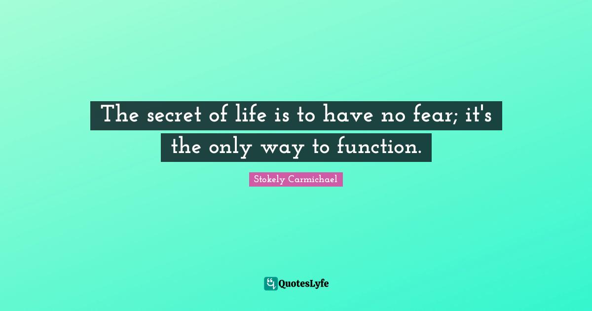 This page presents the quote "The secret of life is to have no fear; it's the only way to function.". Author of this quote is Stokely Carmichael. This quote is about no fear, secret, way, life is, function, have no fear,.