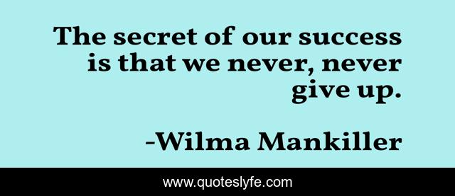 This page presents the quote "The secret of our success is that we never, never give up.". Author of this quote is Wilma Mankiller. This quote is about secret, never give up,.
