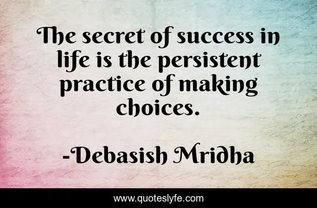 This page presents the quote "The secret of success in life is the persistent practice of making choices.". Author of this quote is Debasish Mridha. This quote is about practice, mridha, debasish, debasish-mridha, persistent, making-choices, secret-of-success, philosophy,.