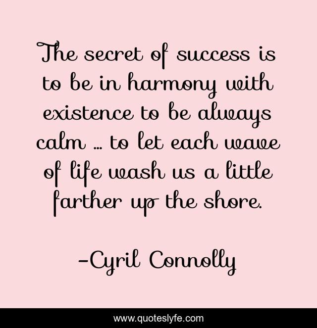 This page presents the quote "The secret of success is to be in harmony with existence to be always calm ... to let each wave of life wash us a little farther up the shore.". Author of this quote is Cyril Connolly. .