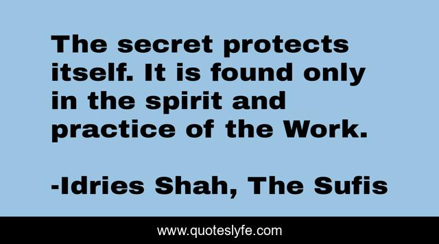 This page presents the quote "The secret protects itself. It is found only in the spirit and practice of the Work.". Author of this quote is Idries Shah, The Sufis. This quote is about sufism, sufis, suf-secrets, wisdom,.