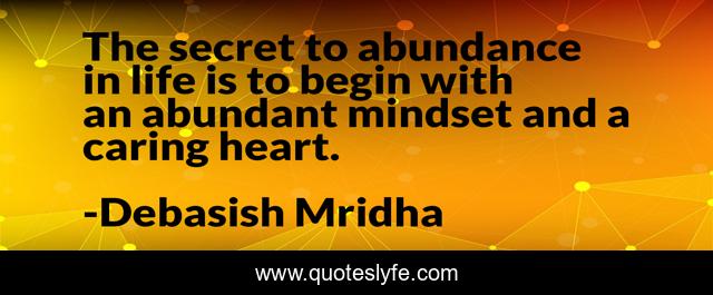 This page presents the quote "The secret to abundance in life is to begin with an abundant mindset and a caring heart.". Author of this quote is Debasish Mridha. This quote is about miraboli, caring-heart, oscar-wilde, abundant-mindset, philosophy, debasish-mridha, quotes, gandhi, inspirational,.