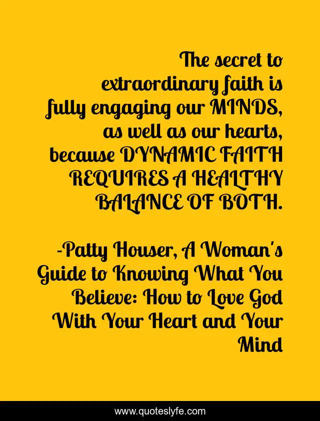 This page presents the quote "The secret to extraordinary faith is fully engaging our MINDS, as well as our hearts, because DYNAMIC FAITH REQUIRES A HEALTHY BALANCE OF BOTH.". Author of this quote is Patty Houser, A Woman's Guide to Knowing What You Believe: How to Love God With Your Heart and Your Mind. This quote is about faith, spiritual-formation, belief, christianity-and-faith, christianity, spiritual-disciplines, inspirational, enthusiasm, beliefs,.