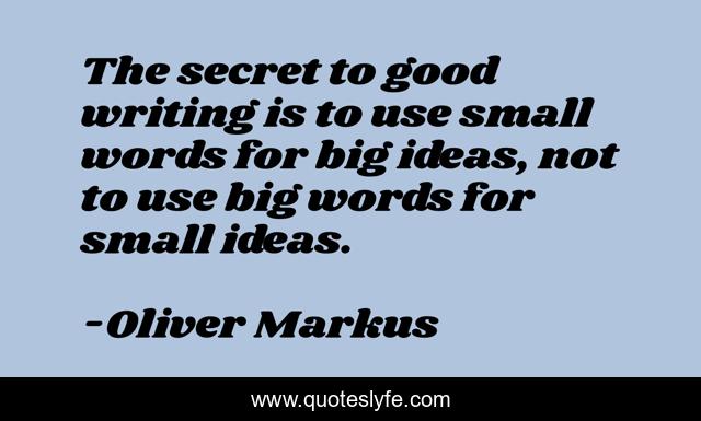 This page presents the quote "The secret to good writing is to use small words for big ideas, not to use big words for small ideas.". Author of this quote is Oliver Markus. This quote is about simplicity, writing-craft, honesty, advice-for-writers, secrets, advice, writing-tips, writing, writers-and-writing,.