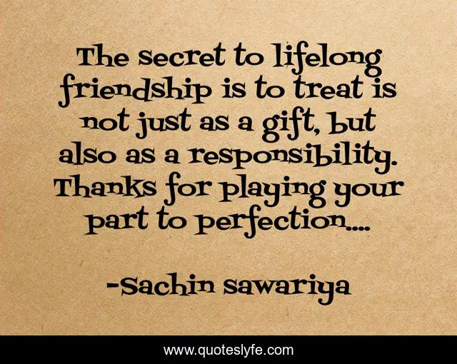 This page presents the quote "The secret to lifelong friendship is to treat is not just as a gift, but also as a responsibility. Thanks for playing your part to perfection....". Author of this quote is Sachin sawariya. This quote is about love, affection,.