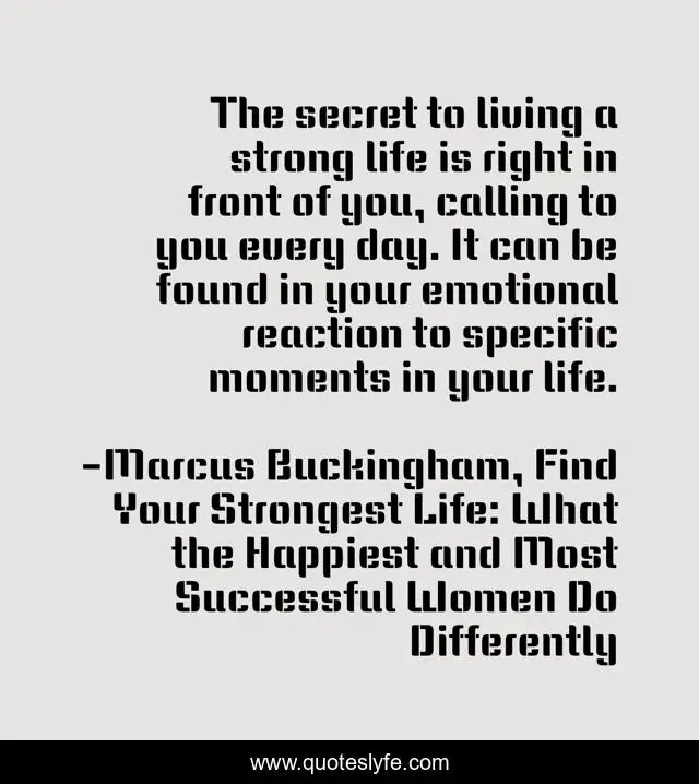 This page presents the quote "The secret to living a strong life is right in front of you, calling to you every day. It can be found in your emotional reaction to specific moments in your life.". Author of this quote is Marcus Buckingham, Find Your Strongest Life: What the Happiest and Most Successful Women Do Differently. This quote is about confidence, positive, motivational, optimistic, strong, happiness,.