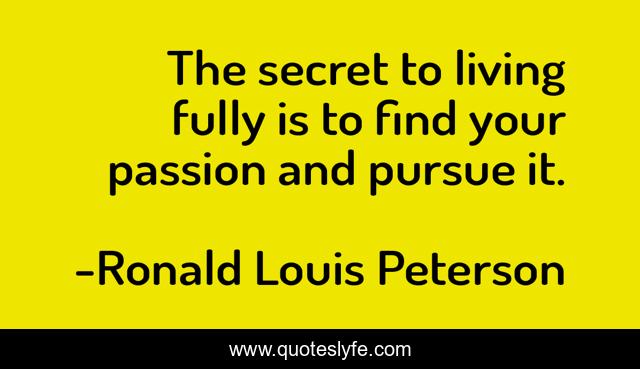 This page presents the quote "The secret to living fully is to find your passion and pursue it.". Author of this quote is Ronald Louis Peterson. This quote is about hope-story, faith-story, spiritual-story, christian-story, charity-story, baby-boomer-story, love-story, peace-corps-story, 9-11-survival-story,.
