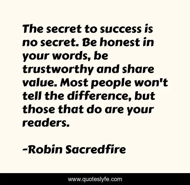 This page presents the quote "The secret to success is no secret. Be honest in your words, be trustworthy and share value. Most people won't tell the difference, but those that do are your readers.". Author of this quote is Robin Sacredfire. This quote is about success, writing, writers, books, authors, success-as-author, ebooks,.