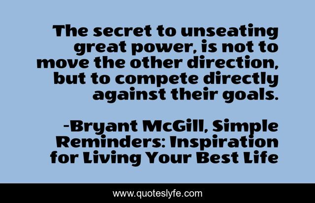 This page presents the quote "The secret to unseating great power, is not to move the other direction, but to compete directly against their goals.". Author of this quote is Bryant McGill, Simple Reminders: Inspiration for Living Your Best Life. This quote is about secrets, competition, goalss, power, greatness,.