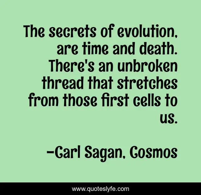 This page presents the quote "The secrets of evolution, are time and death. There's an unbroken thread that stretches from those first cells to us.". Author of this quote is Carl Sagan, Cosmos. This quote is about science, evolution, connectedness, history-of-mankind,.