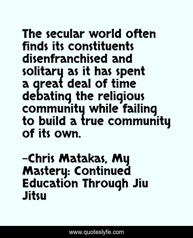 This page presents the quote "The secular world often finds its constituents disenfranchised and solitary as it has spent a great deal of time debating the religious community while failing to build a true community of its own.". Author of this quote is Chris Matakas, My Mastery: Continued Education Through Jiu Jitsu. This quote is about religion, secular, debate, community,.